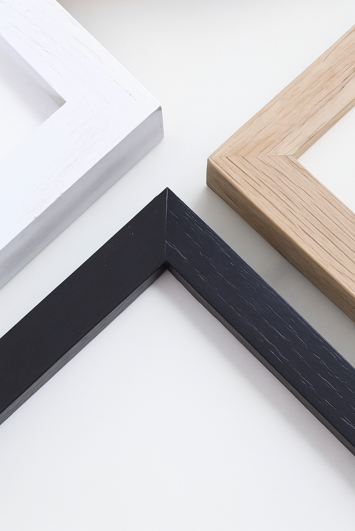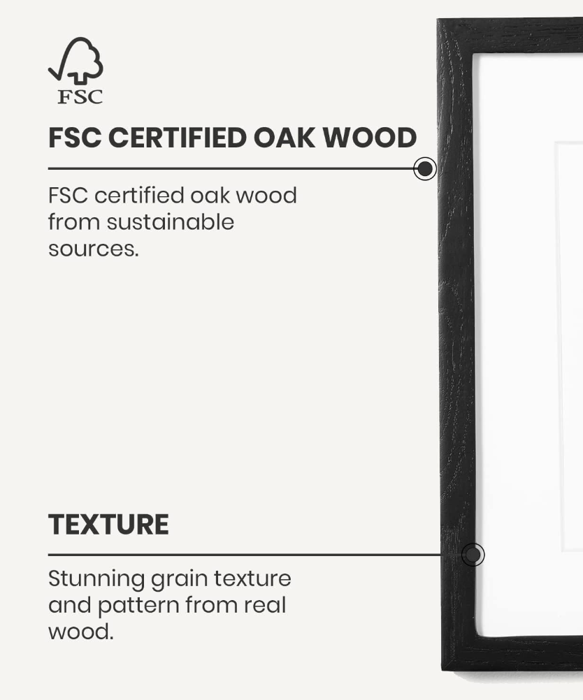 Choose from three sustainable oak frames featuring a clear shatterproof plexiglass front and a natural wood grain finish.